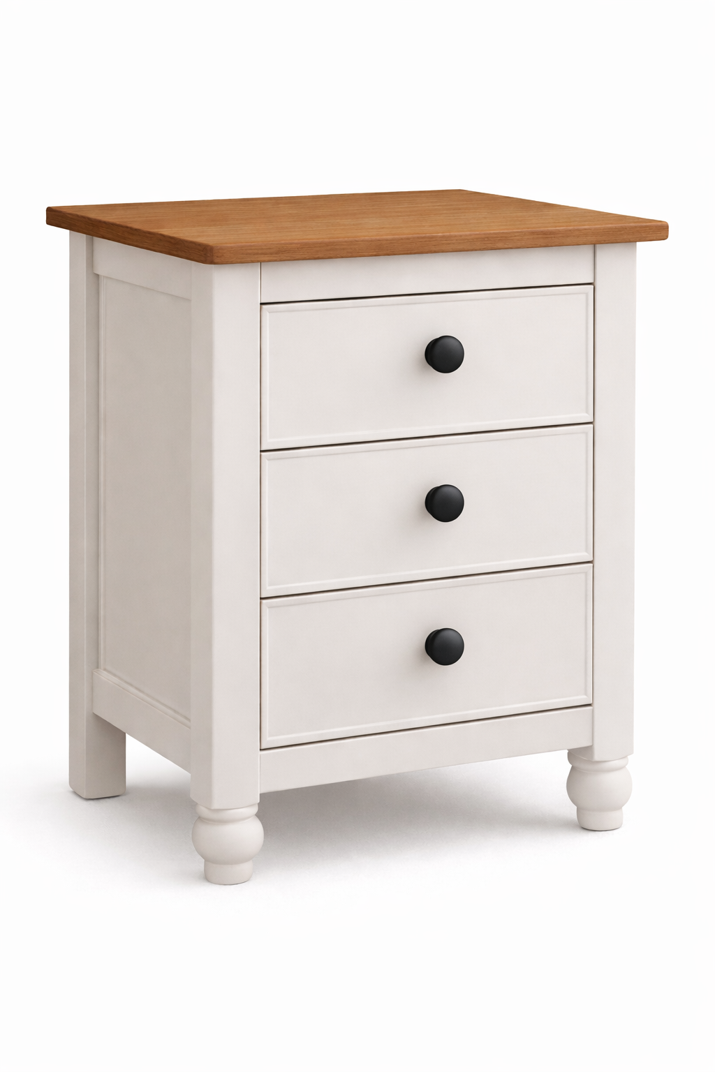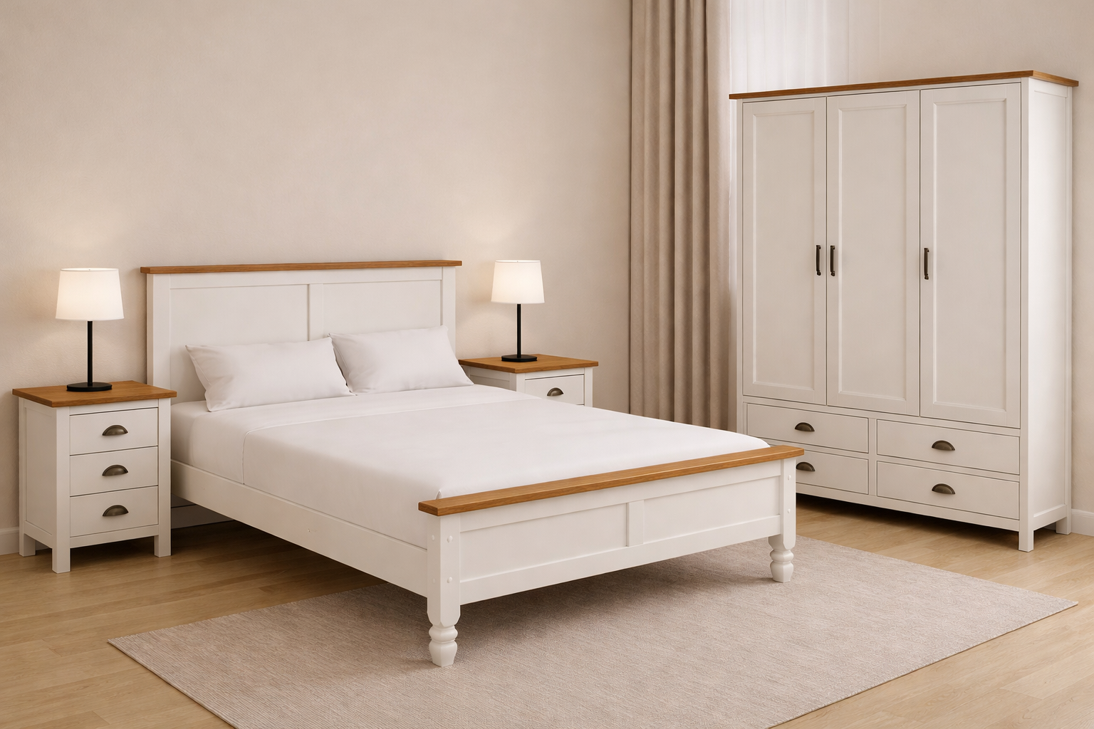 طقم غرفة نوم بتصميم أنيق يجمع بين اللون الأبيض النقي والسطح الخشبي الطبيعي، ليعطي إحساس بالهدوء والنظافة مع لمسة دفء راقية.